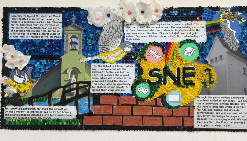 In June 2025, Ms.Fitzpatrick and groups of pupils from Scoil Naomh Eoin unveiled a mural made of bottle caps and recycled materials which details the history of how our school came to be at its current location. The mural takes pride of place in our school hall. Please see below for an image of our beautiful mural, photos of the school and St.John's Church which were incorporated into the design.